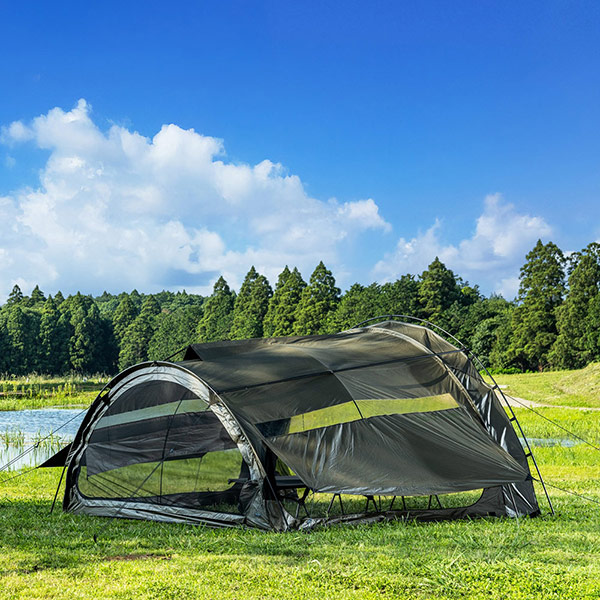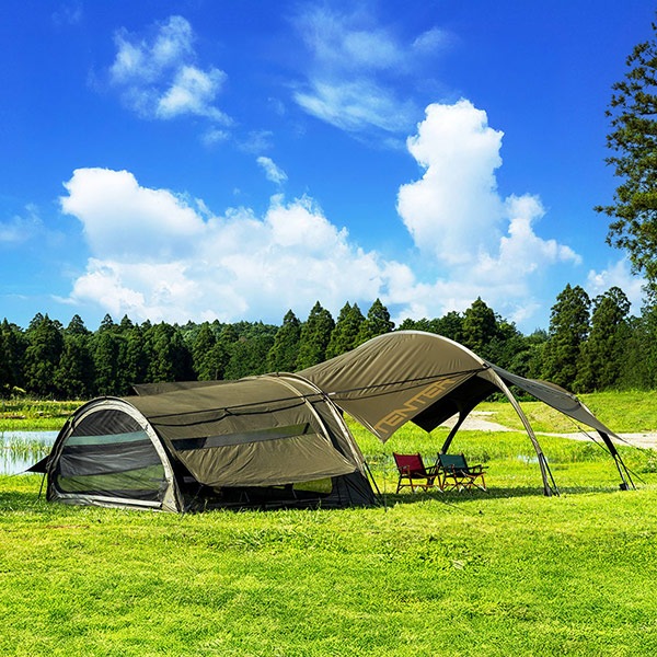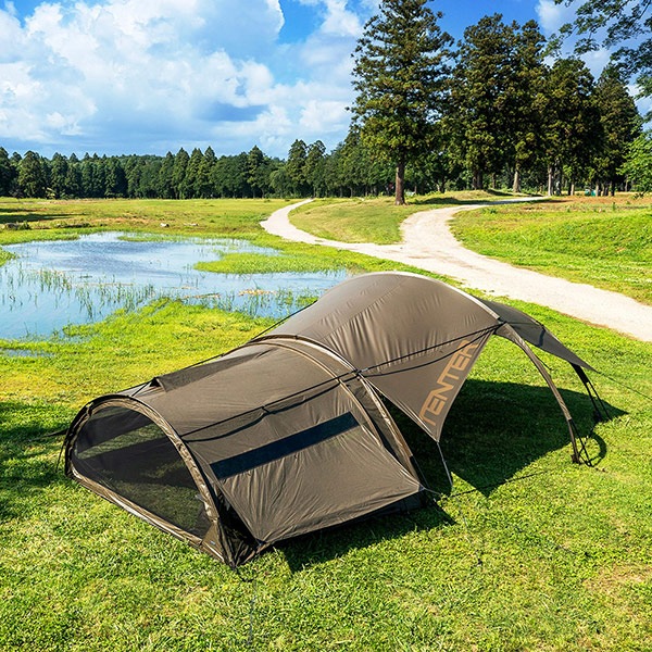 連結部分は、ファスナーで隙間無く、簡単に取り付けられる仕様。付属の吊り下げ式のインナールームは、コットン製で結露を防ぎ、快適に過ごす事ができます。前後の入口とサイドにはメッシュパネル、天井のベンチレーションが通気性を確保し、就寝時にはフルクローズもできます。
